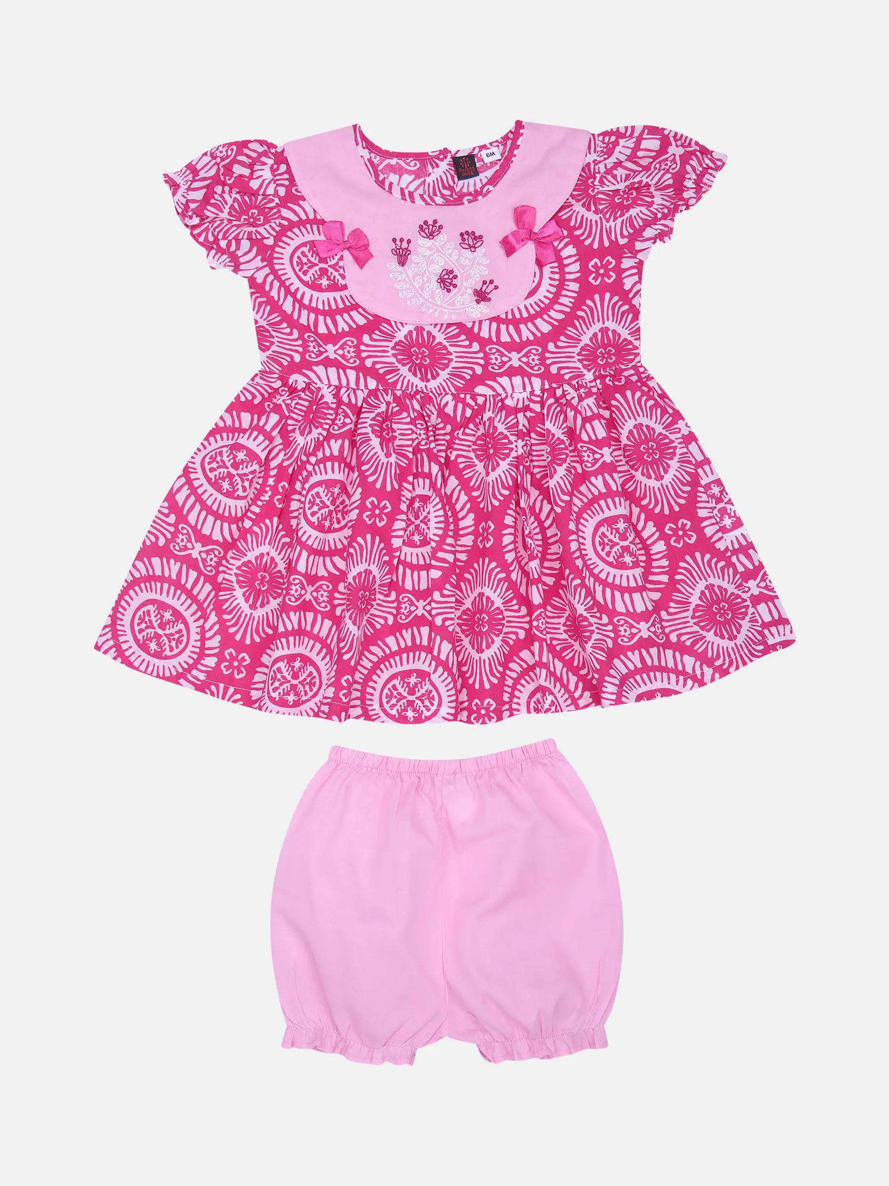 Pink cotton frock with prints. Comes with matching voile panty or nappy.