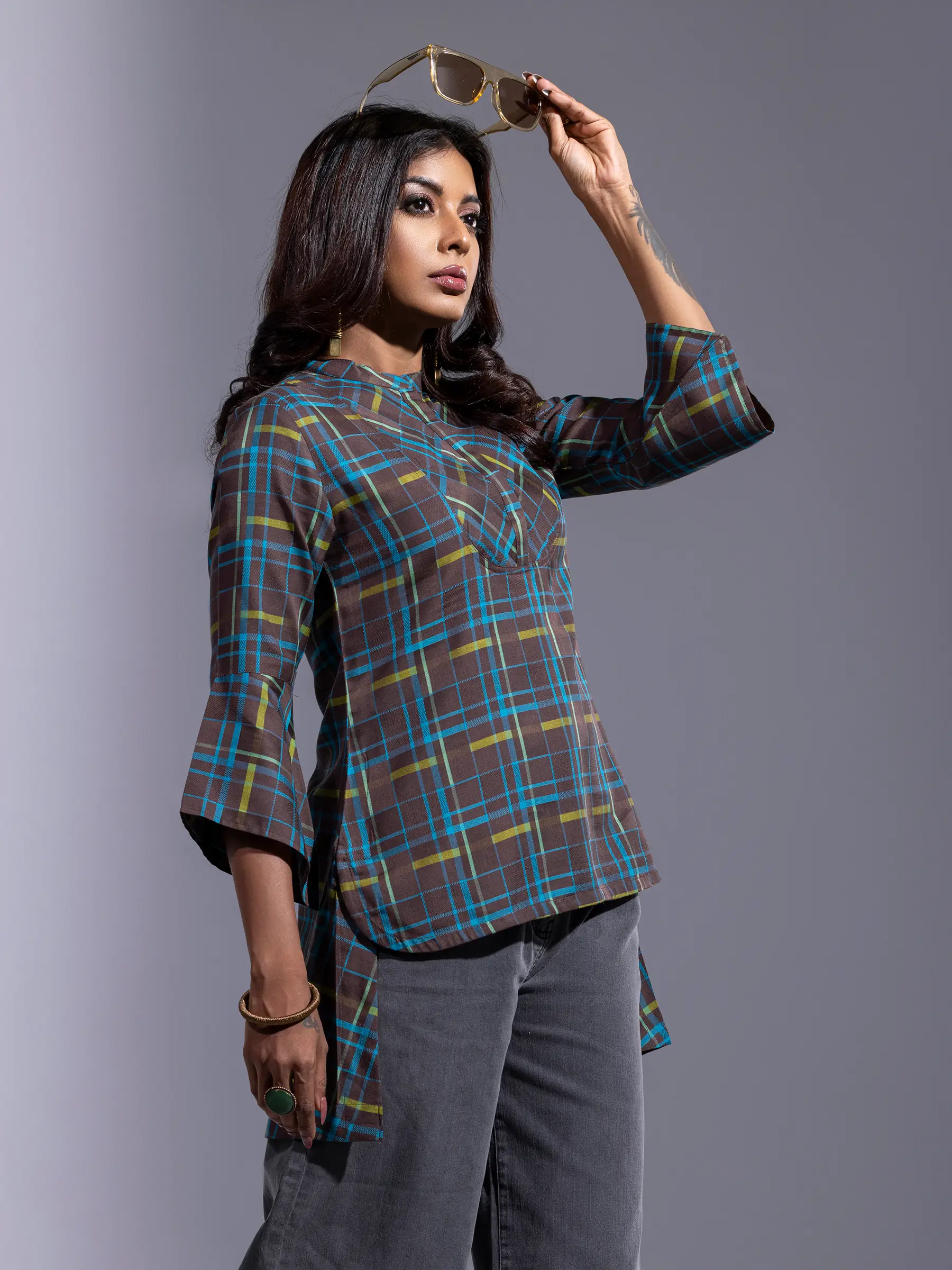 Yellow ochre printed mixed viscose kurta with arri embroidery.