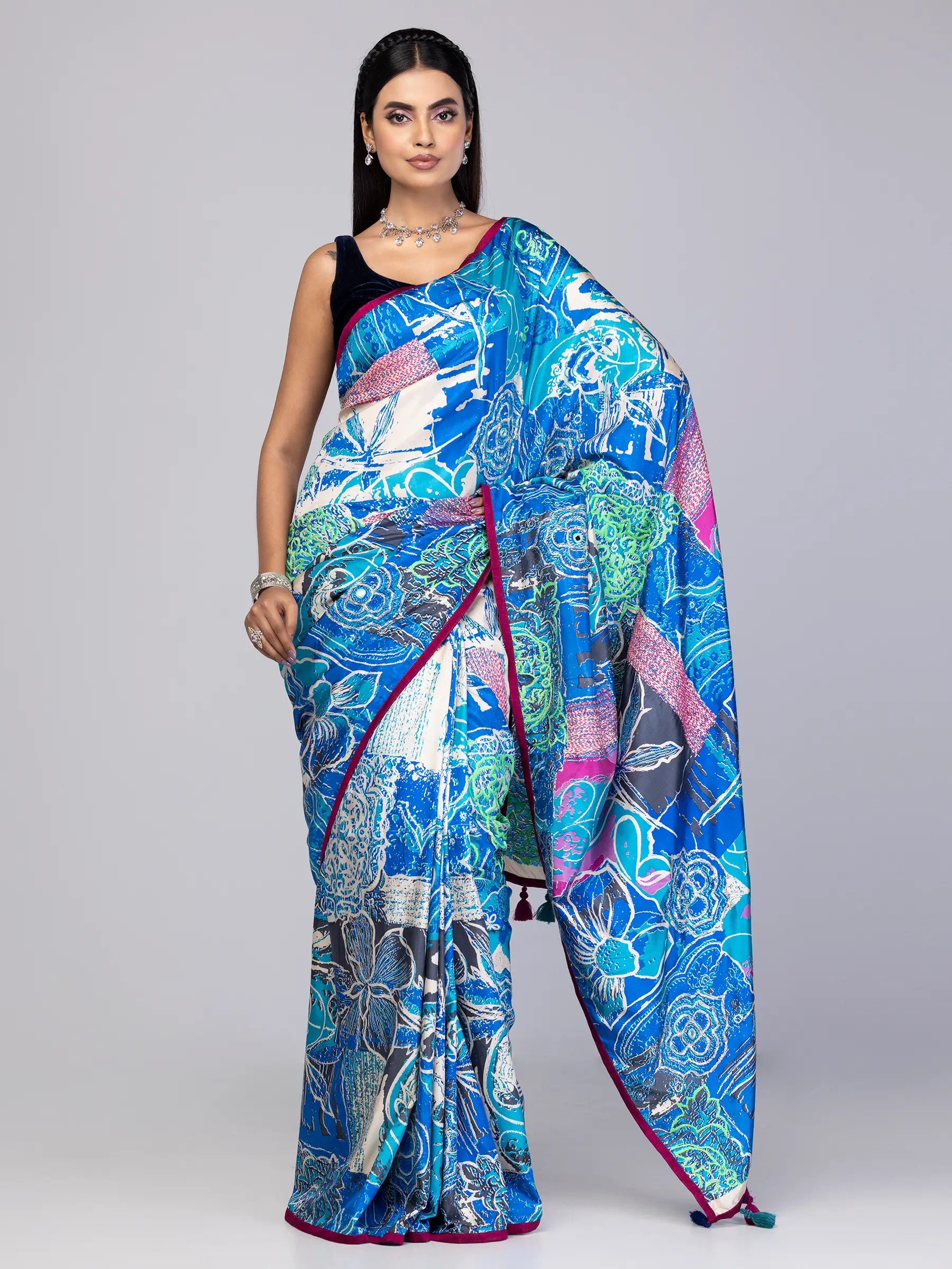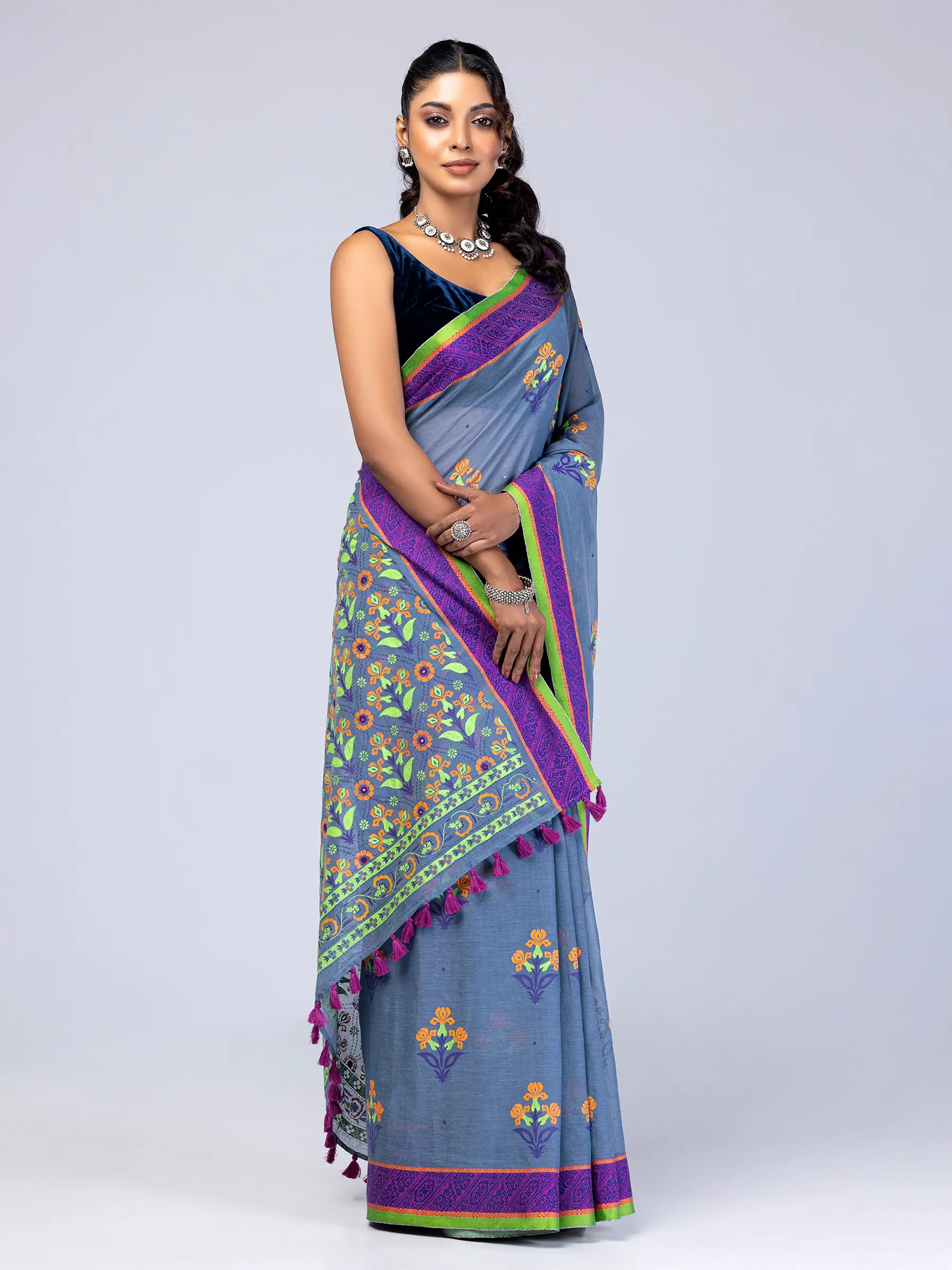 Royal blue appliqued muslin saree with blue, turquoise, yellow, silver, peach and grey embroidery. Comes with matching unstitched blouse piece attached at the end of saree. Blouse shown in the photo is a styling suggestion, it is not a part of the actual product.