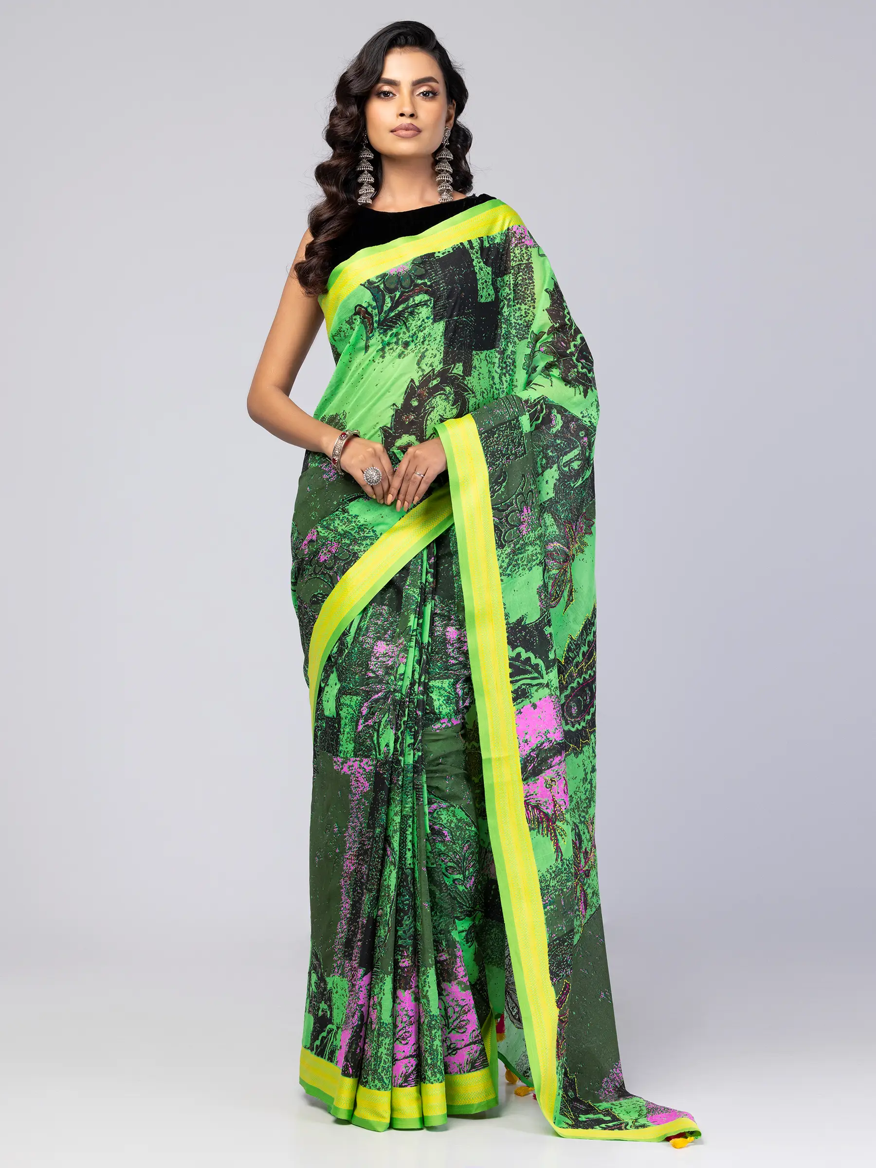 Green printed cotton saree with pink, yellow, maroon, red and brown embroidery. Comes with matching unstitched blouse piece attached at the end of saree. Blouse shown in the photo is a styling suggestion, it is not a part of the actual product.