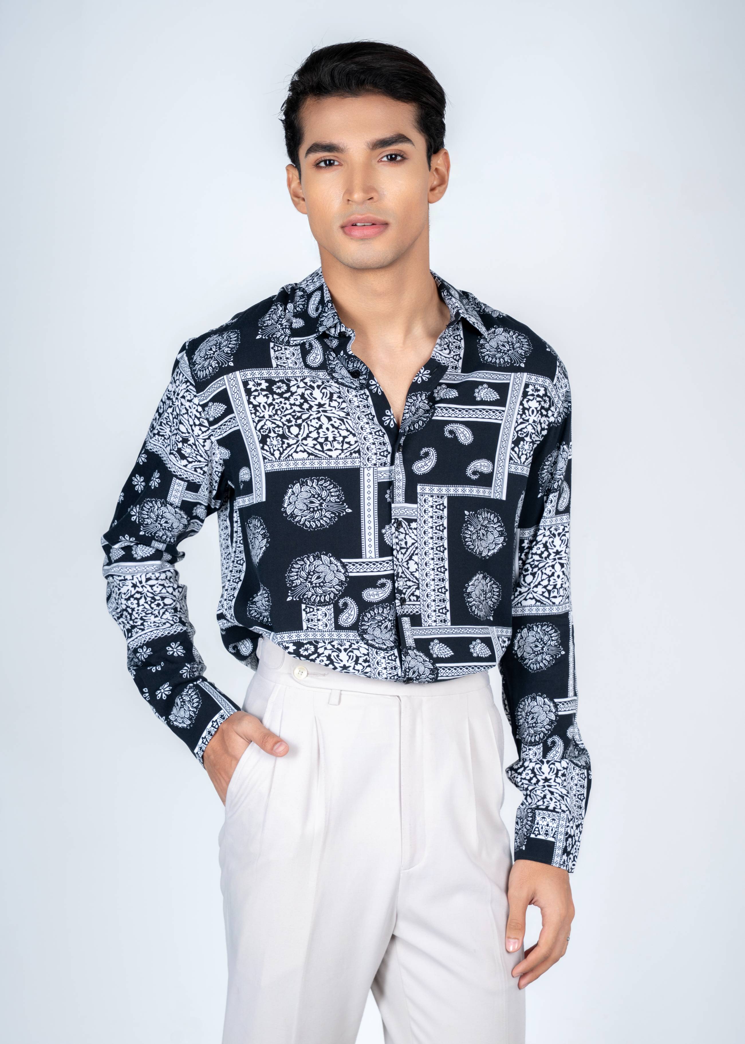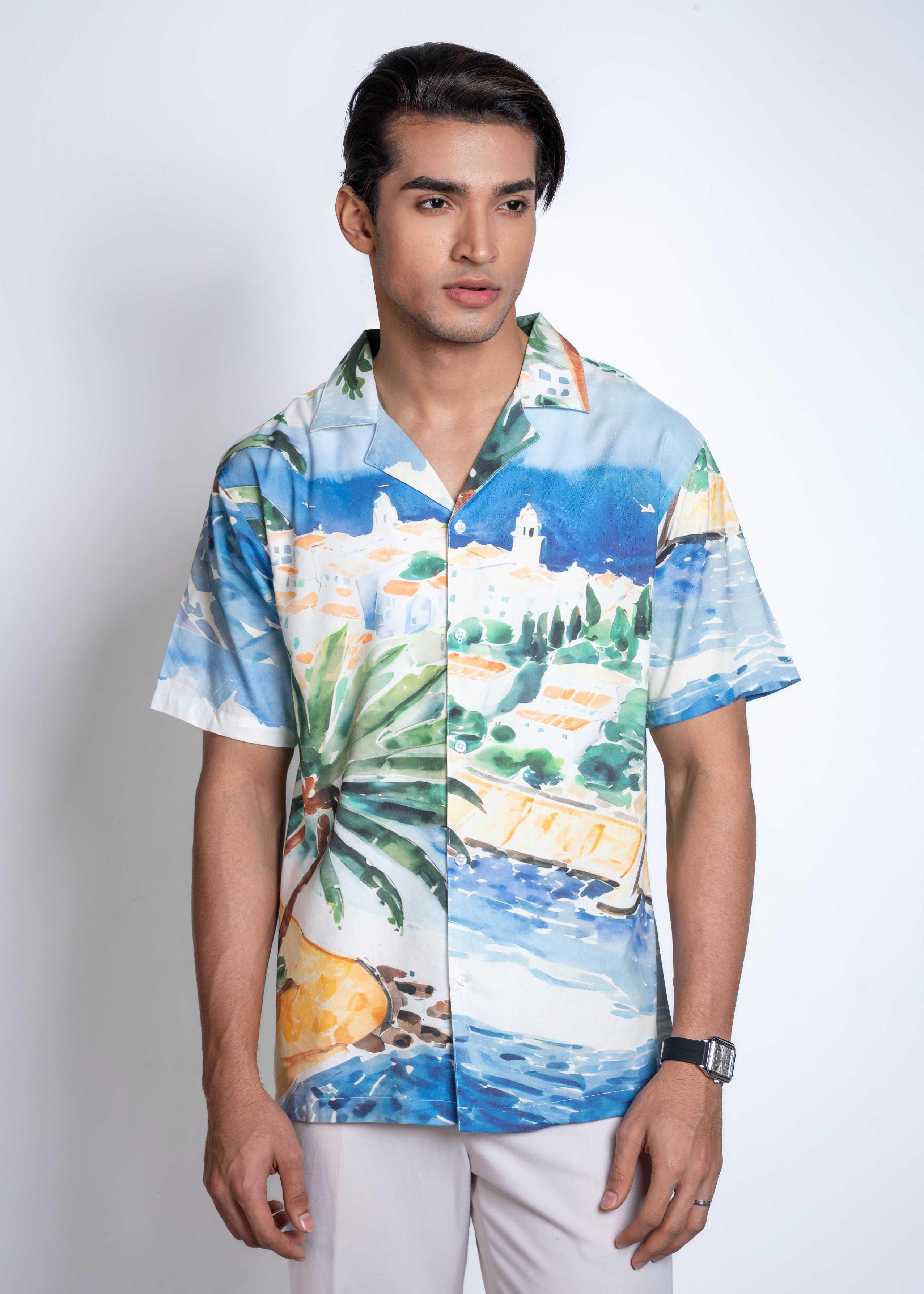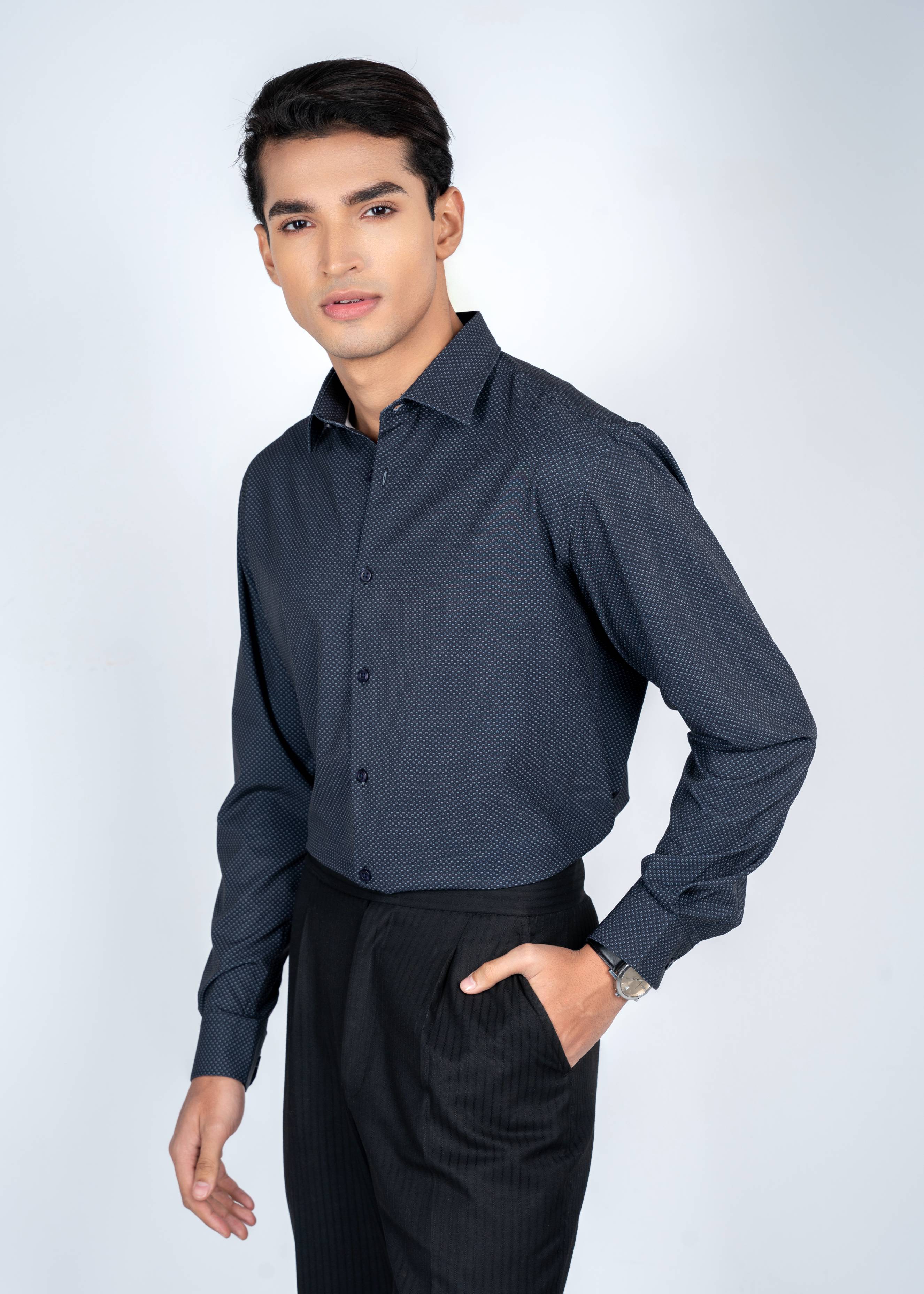 Blue texture endi silk panjabi with white and grey prints . Features in-seam side pockets.